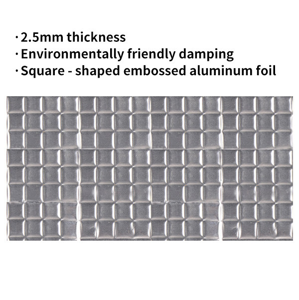 1. Pad de amortiguación de vibraciones de 2,5 mm de espesor/folla de aluminio superficial + relieve cuadrado + capa de amortiguación respetuosa con el medio ambiente + papel kraft de liberación de aceite de silicona de un solo lado (con impresión)